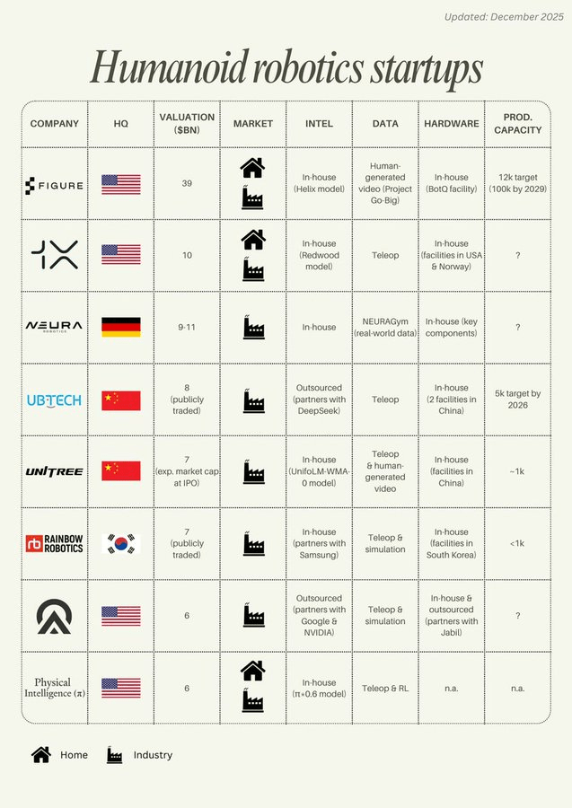 The valuations in humanoid robotics startups are turning heads, with Figure towering at $39B while others linger around $6B to $11B. It’s not just numbers–Figure’s push to own the entire stack sets them apart.