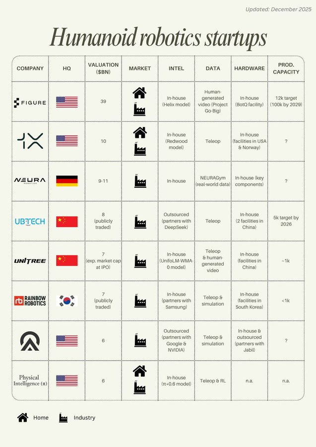 The valuations in humanoid robotics startups are turning heads, with Figure towering at $39B while others linger around $6B to $11B. It’s not just numbers–Figure’s push to own the entire stack sets them apart.